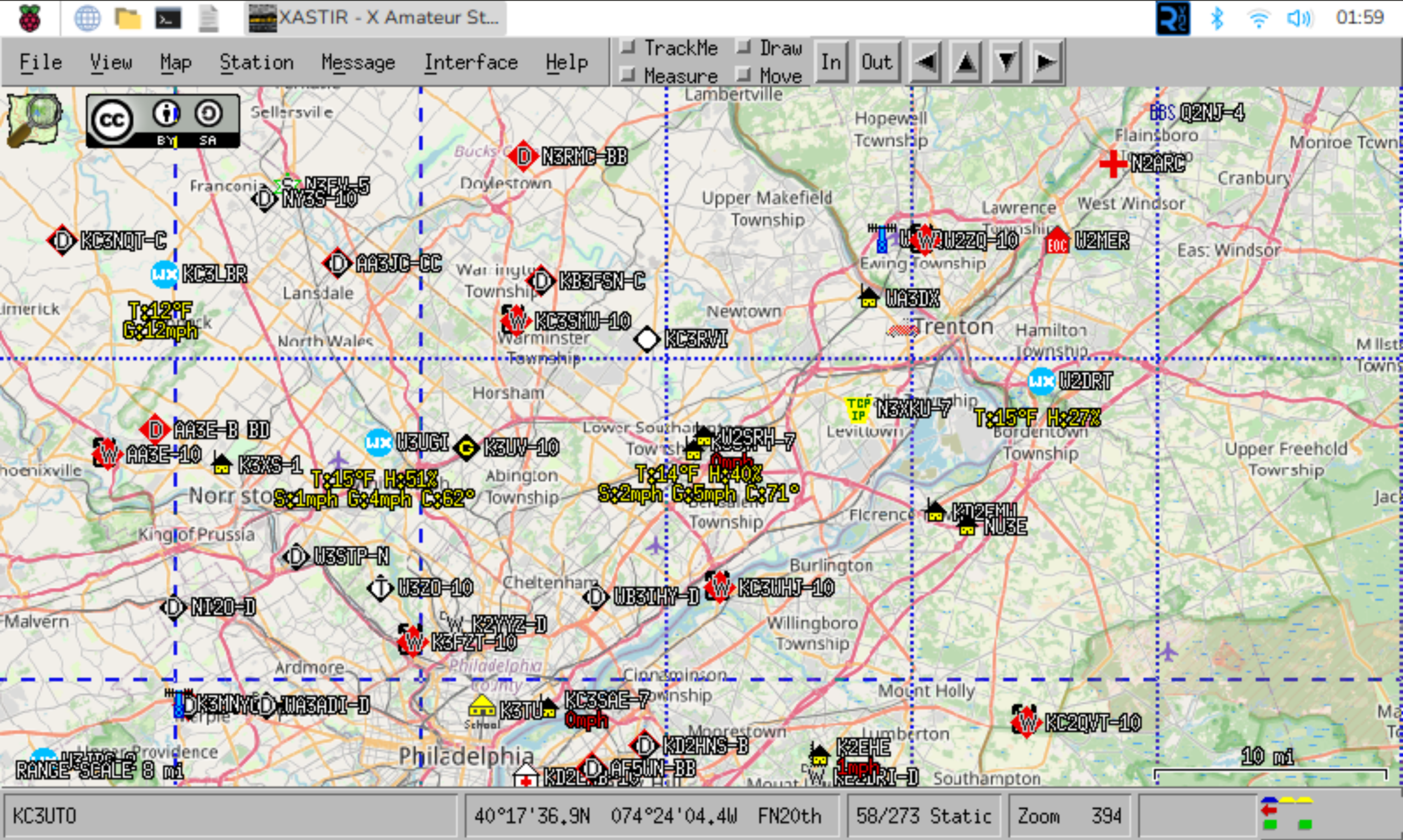 Ok, I think that’s enough back story. And at this point I’ve probably taken up more time than you were willing to give me, so I’ll be surprised if you keep reading. But maybe I’ve only piqued your interest and you’d like to hear more over a cup of coffee. Well, go pour one and I’ll keep typing. So years ago I had an APRS station running at our last house, and it worked pretty well, but the software was running on my computer. The problem with that is that once I got a radio in the truck that could also do APRS, there was no way for Stephanie to use the software to send me a message or even look to see where I am (without looking on the website, of course). Plus it meant if I had to do something on the computer that took it offline, the APRS station went offline too. With Raspberry Pi machines being only about $35, and accessories not too much more at the time, I picked up a 7″ touchscreen display that the rPi 3B+ would mount right onto and configured them to run Raspbian Linux, installed my favorite APRS client Xastir on there, and now had the benefit that if my wife (and later my daughter) wanted to see what was up they could just touch the screen to wake it, and even use the nearby Bluetooth keyboard to send a message to me in the truck. In Morrisville, the station wasn’t highly useful because there was plenty of other stuff nearby, but I enjoyed running it. Once I moved to Trevose, however, I found that there was a bit of a dead spot near my house (which is also near where Street Road, I-95, and the PA Turnpike meet). So here, the station hears a lot of daily commuters, and helps to get their traffic not only heard onto the Internet but even repeated locally which gets heard across a large area. Oh yeah, did I mention that my station’s packets are heard easily in Somerset, Gloucester, and Ocean Counties in NJ as well as Northampton and Philadelphia Counties in PA? I’m in a really good spot here, and I love seeing that my station is able to help a lot of others.